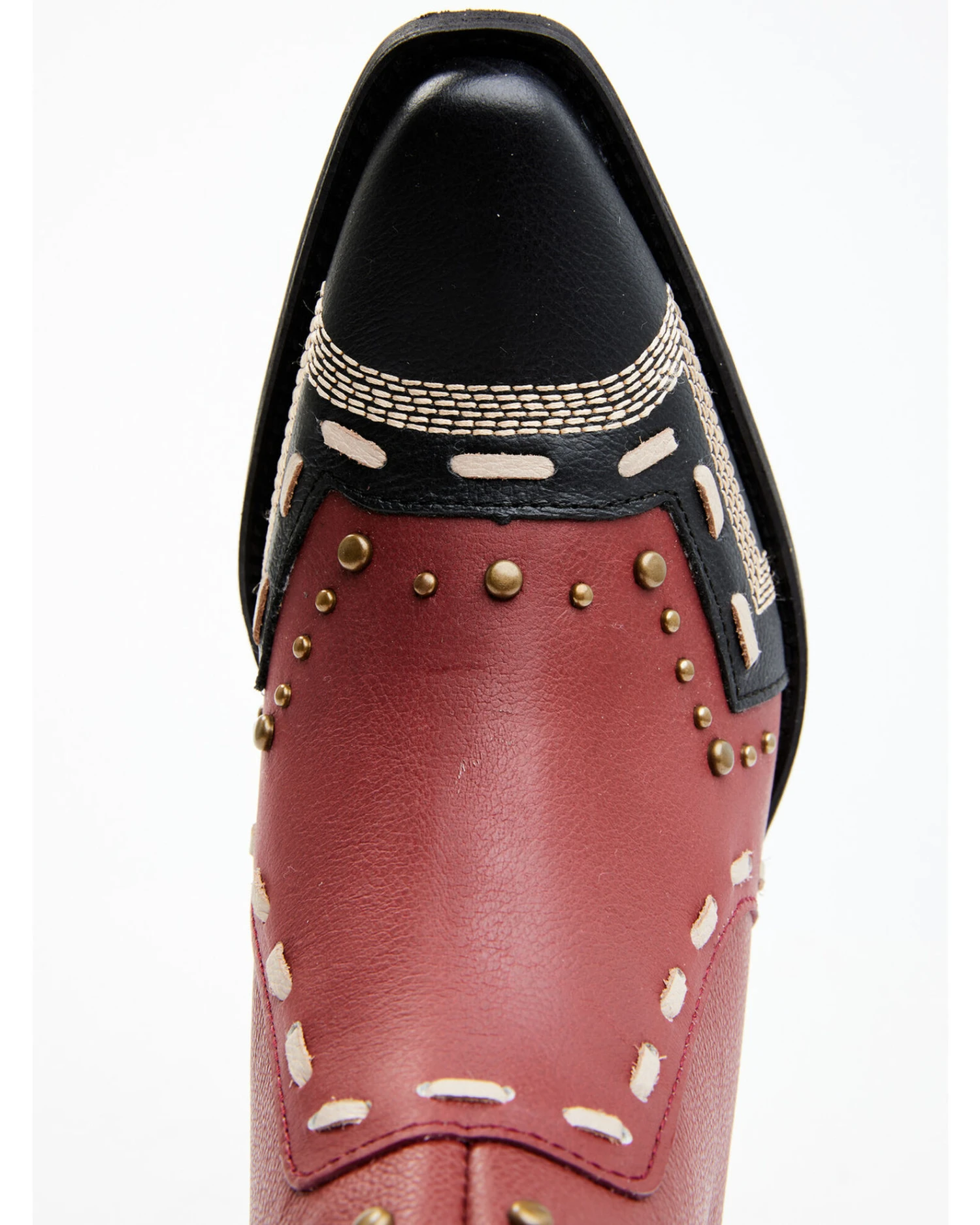 - Two-tone leather design with bronze studded accents and white buck stitching
